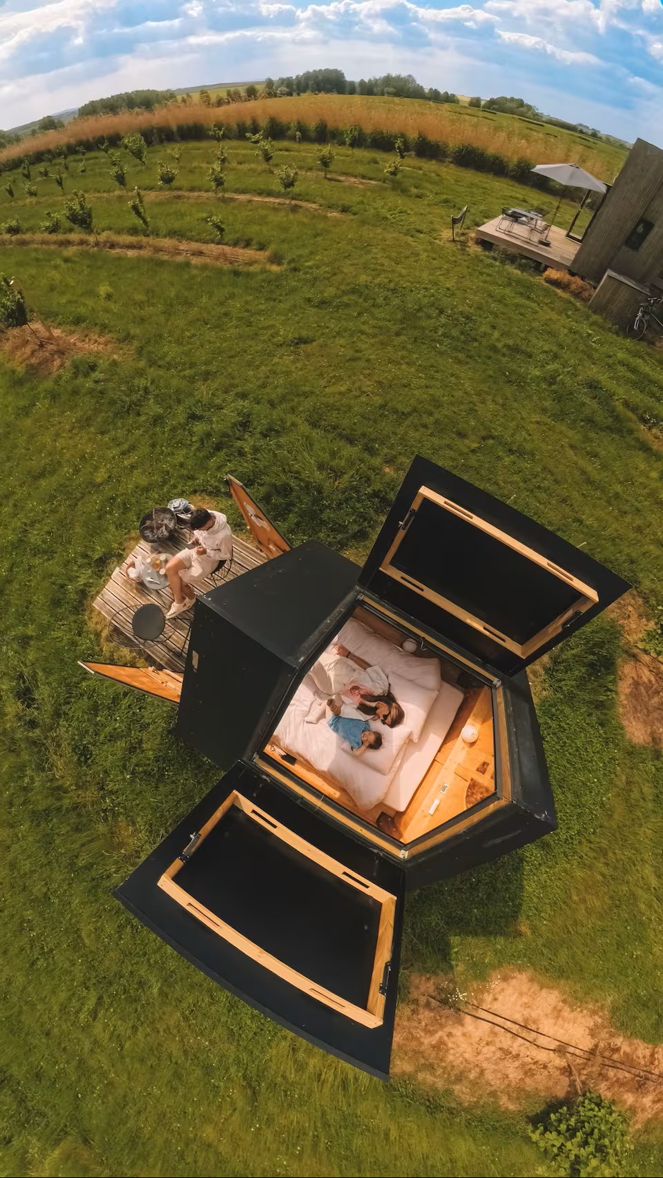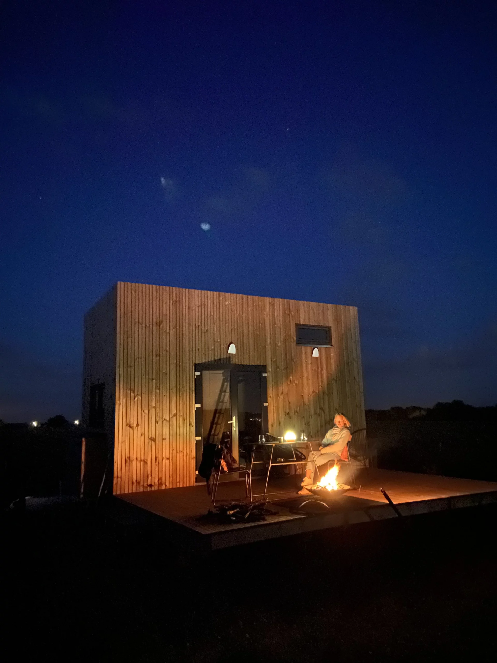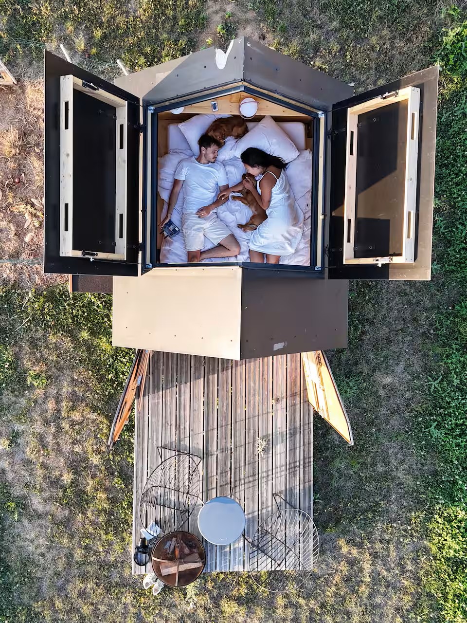 À l’extérieur, une cabane-observatoire au toit ouvrant vous invite à contempler le ciel étoilé ou à profiter de moments de détente uniques en pleine nature.